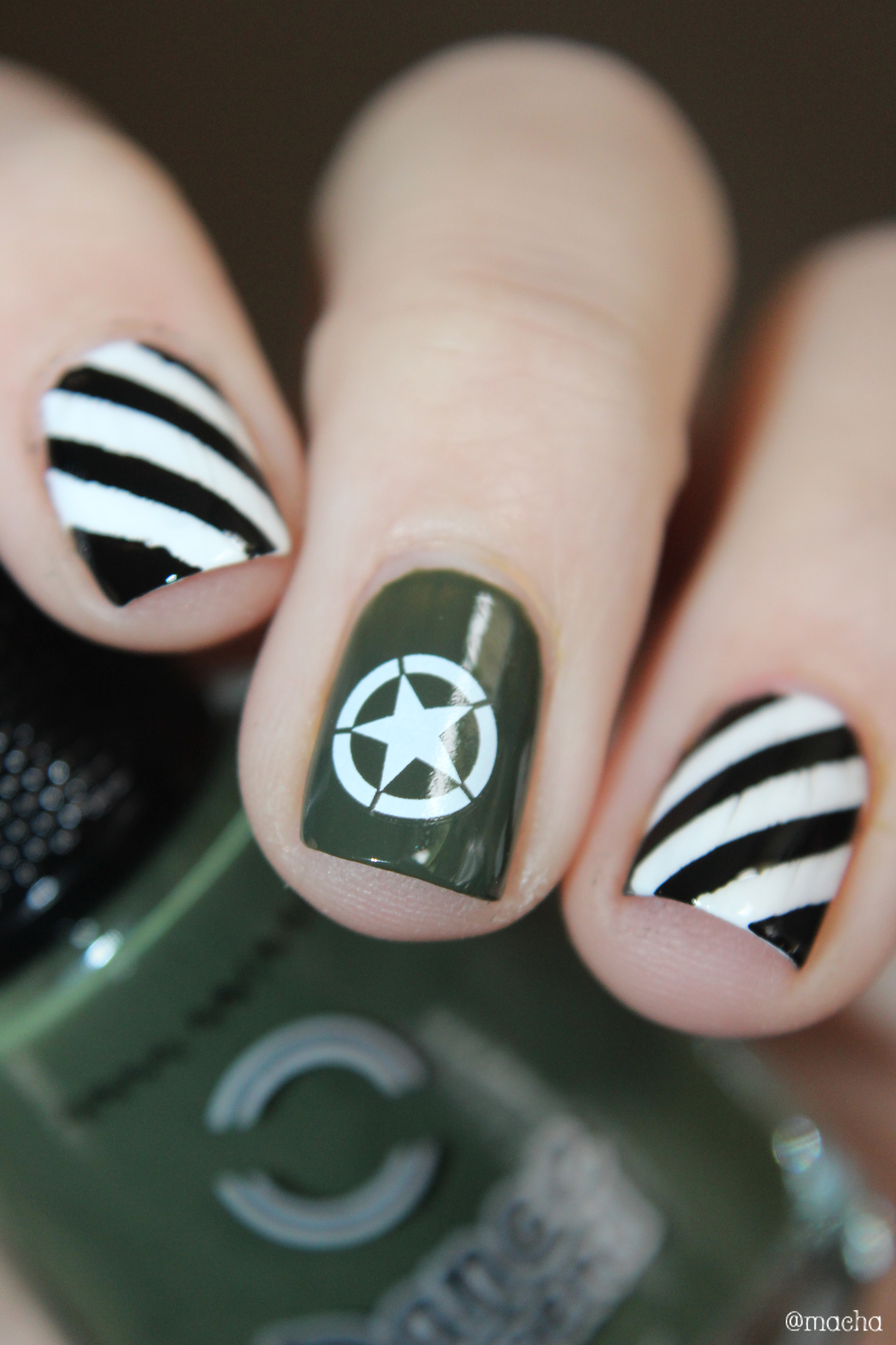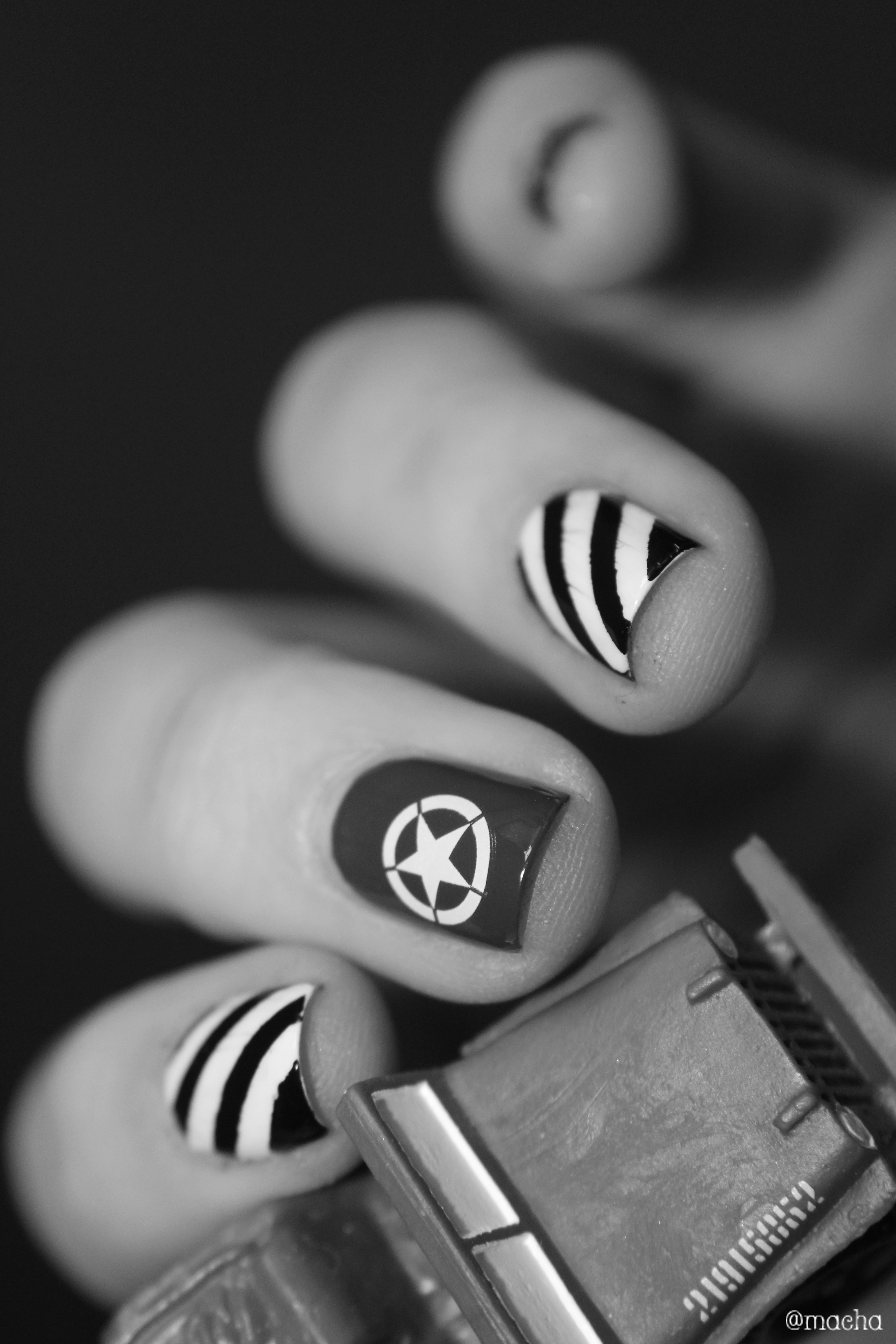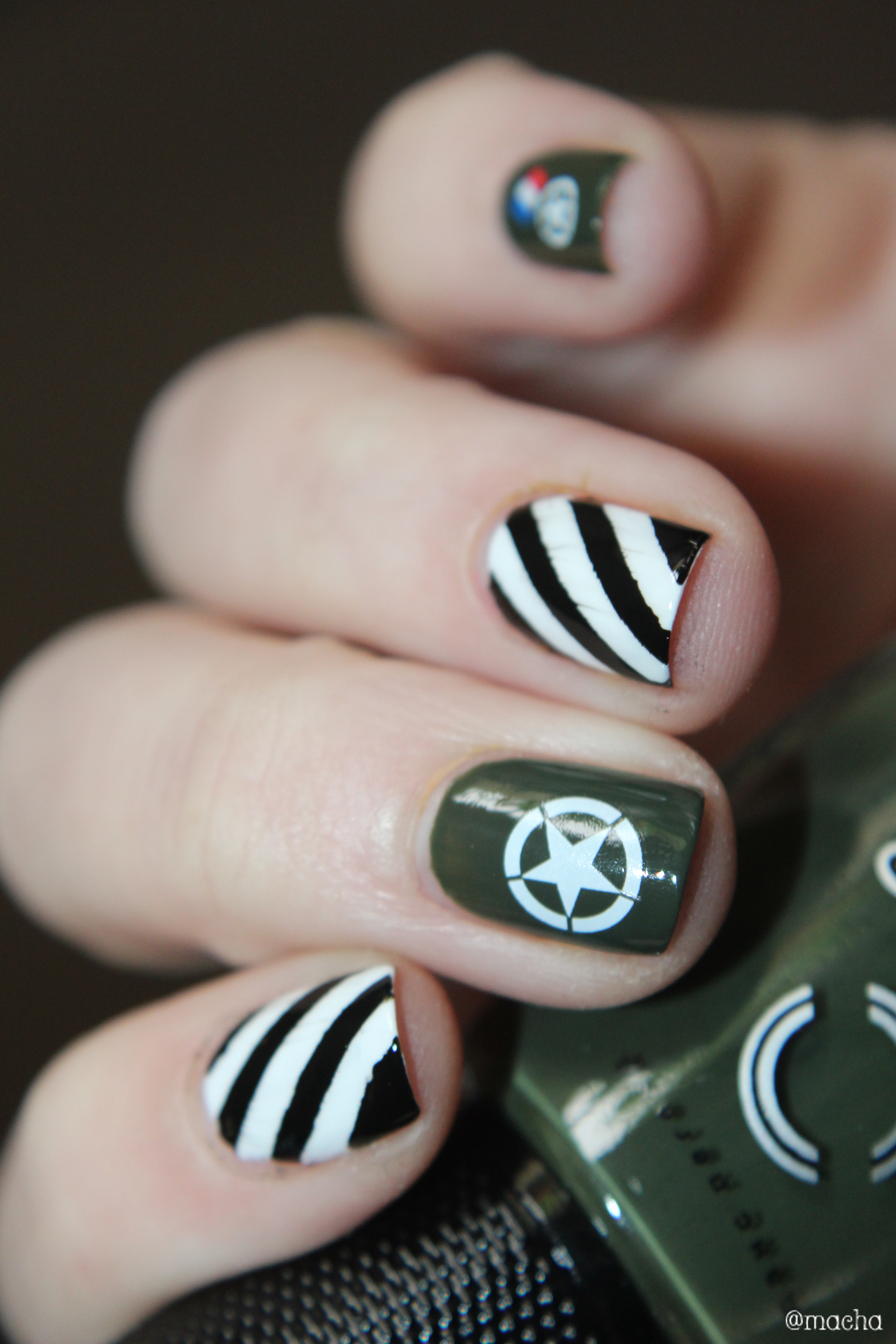 - l’index et l’annulaire réalisés avec des stickers et les vernis Purity et Black is Everything représentent les bandes noires et blanches présentes sur tous les avions ayant participé au débarquement : signe de reconnaissance des troupes alliés, ces bandes étaient appelées les « bandes d’invasion ». Ces bandes étaient peintes au balai sur les carlingues. Je ne me fais pas les ongles au balai… Mais mon top coat a légérement fait bavouillé mon noir… J’espère que vous lui pardonnerez.