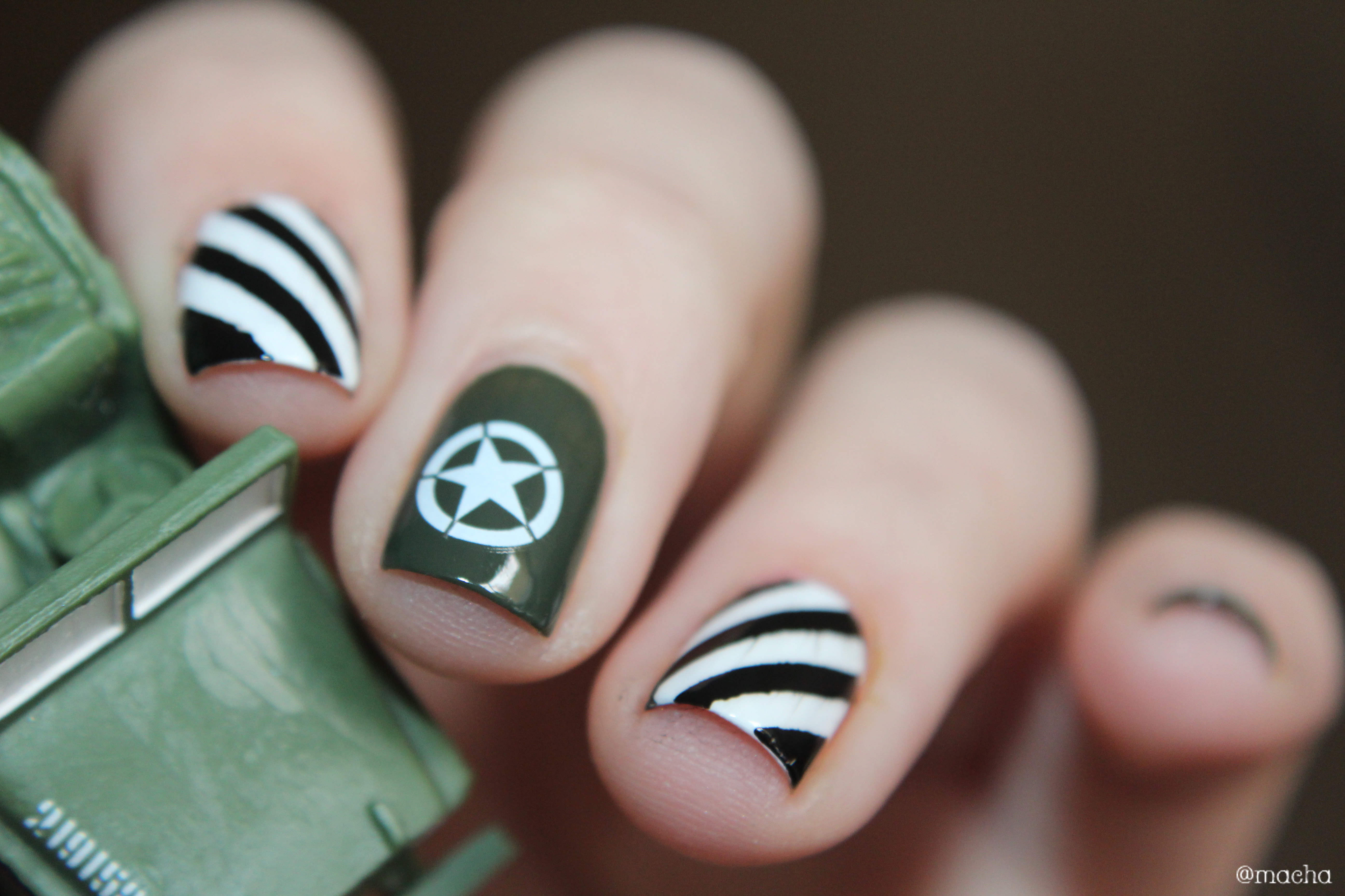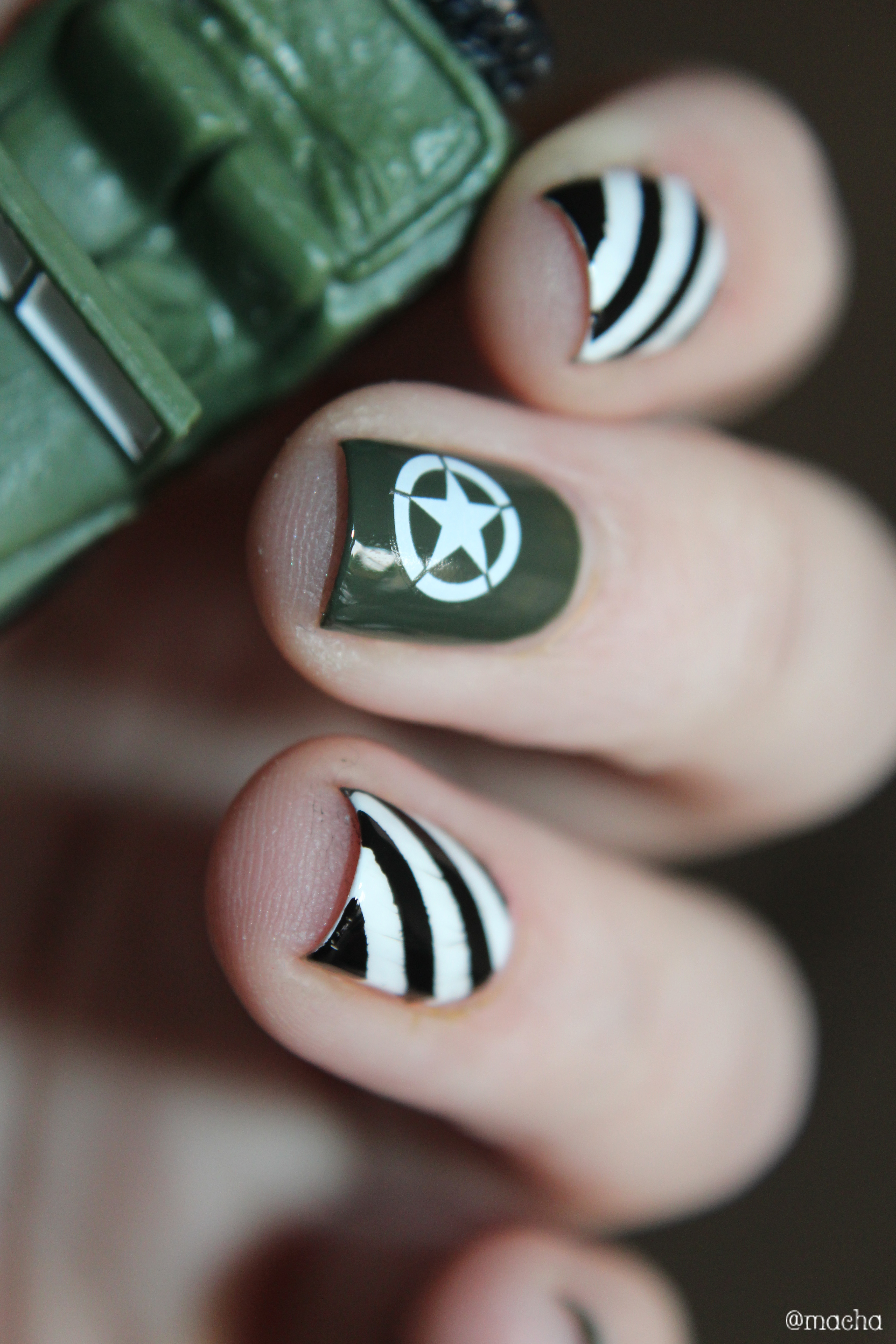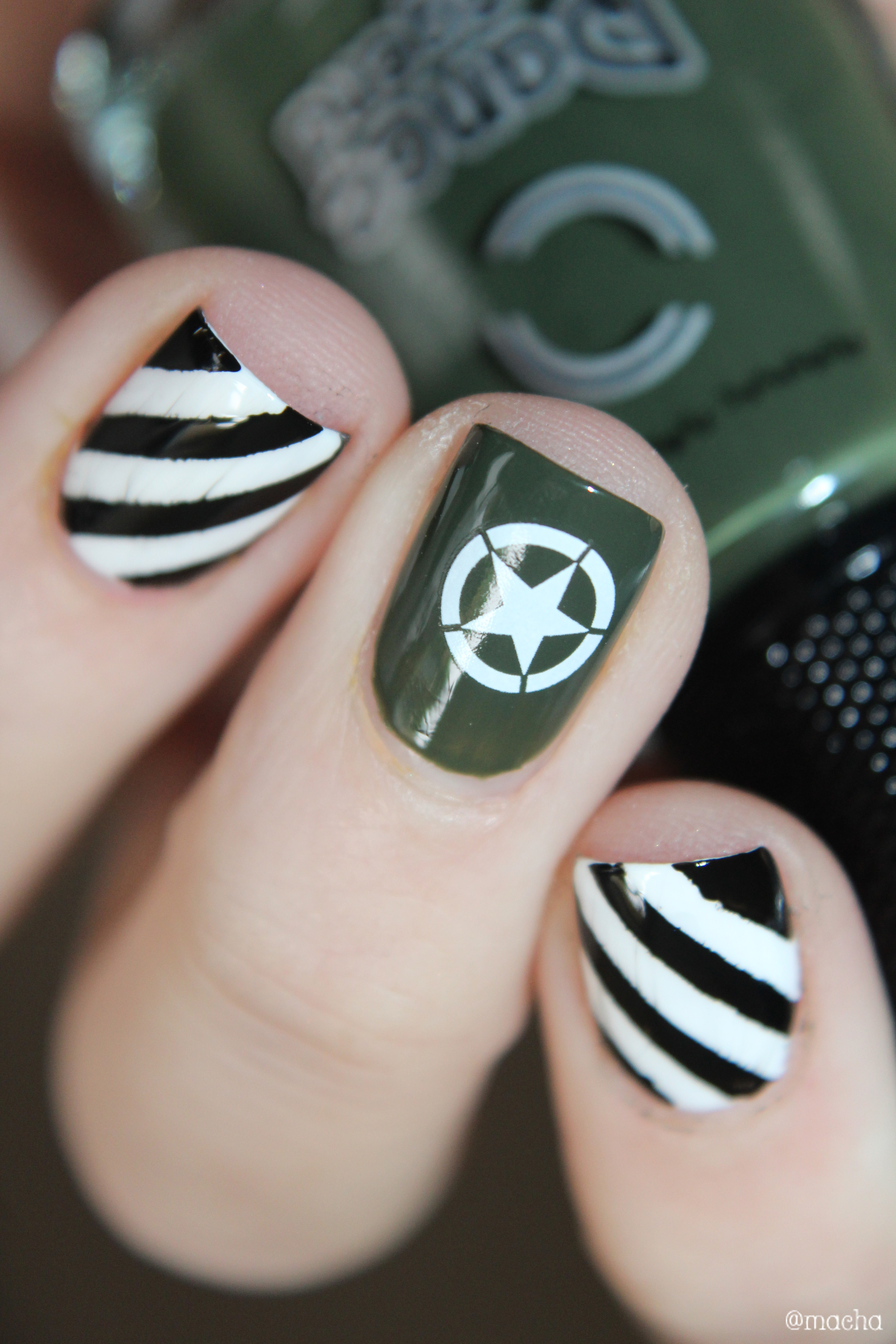 - l’index et l’annulaire réalisés avec des stickers et les vernis Purity et Black is Everything représentent les bandes noires et blanches présentes sur tous les avions ayant participé au débarquement : signe de reconnaissance des troupes alliés, ces bandes étaient appelées les « bandes d’invasion ». Ces bandes étaient peintes au balai sur les carlingues. Je ne me fais pas les ongles au balai… Mais mon top coat a légérement fait bavouillé mon noir… J’espère que vous lui pardonnerez.